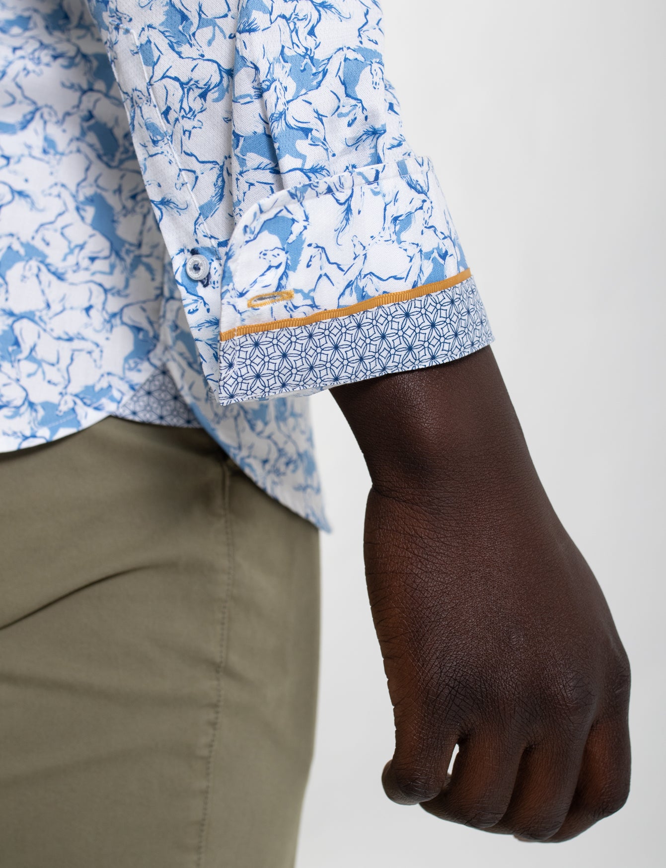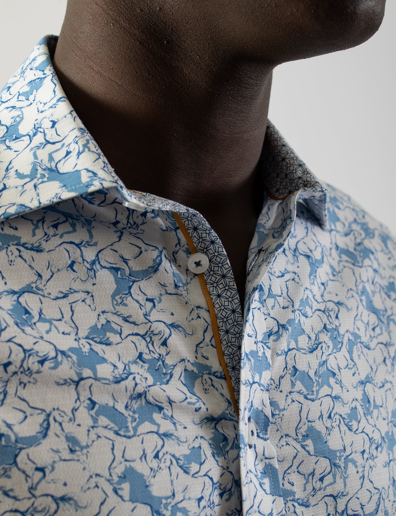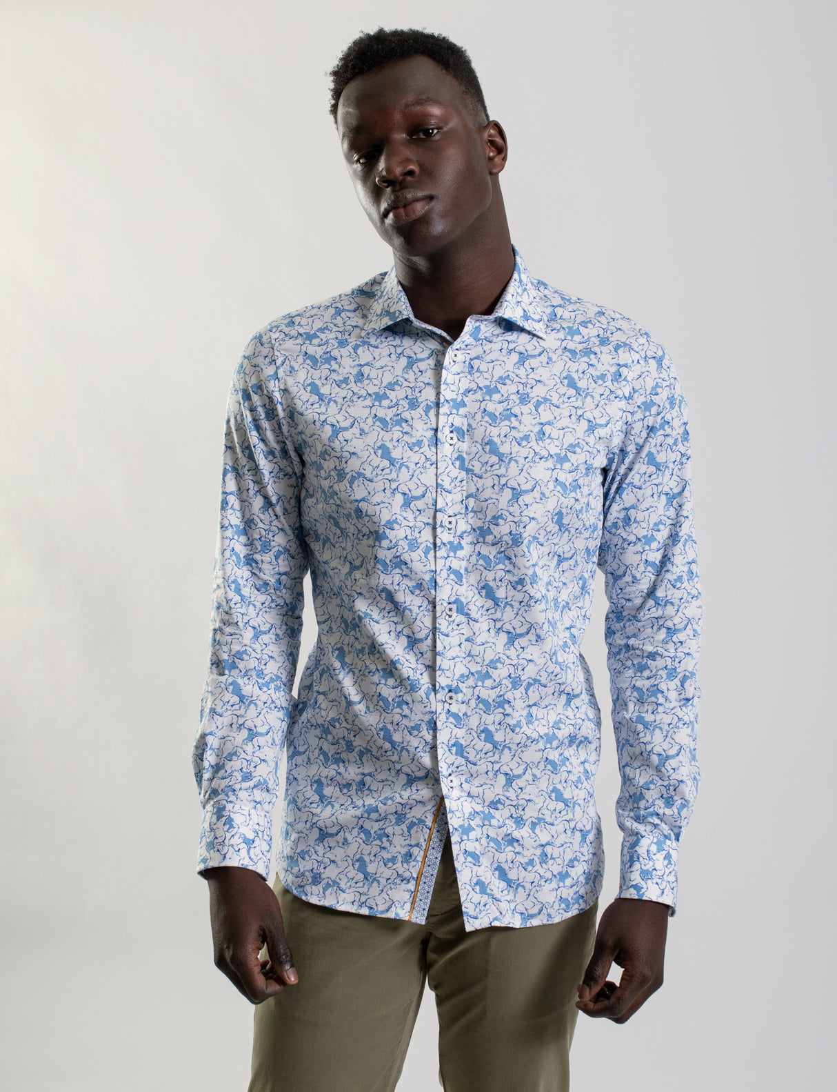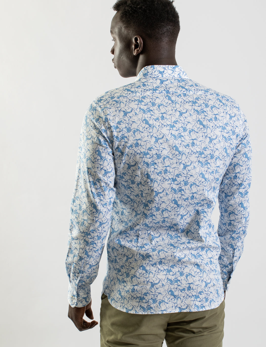 Designed in Melbourne, this super soft print on cotton dobby is light and cool and features hidden geometric trims and James Harper logo buttons. The slim fit creates a flattering silhouette