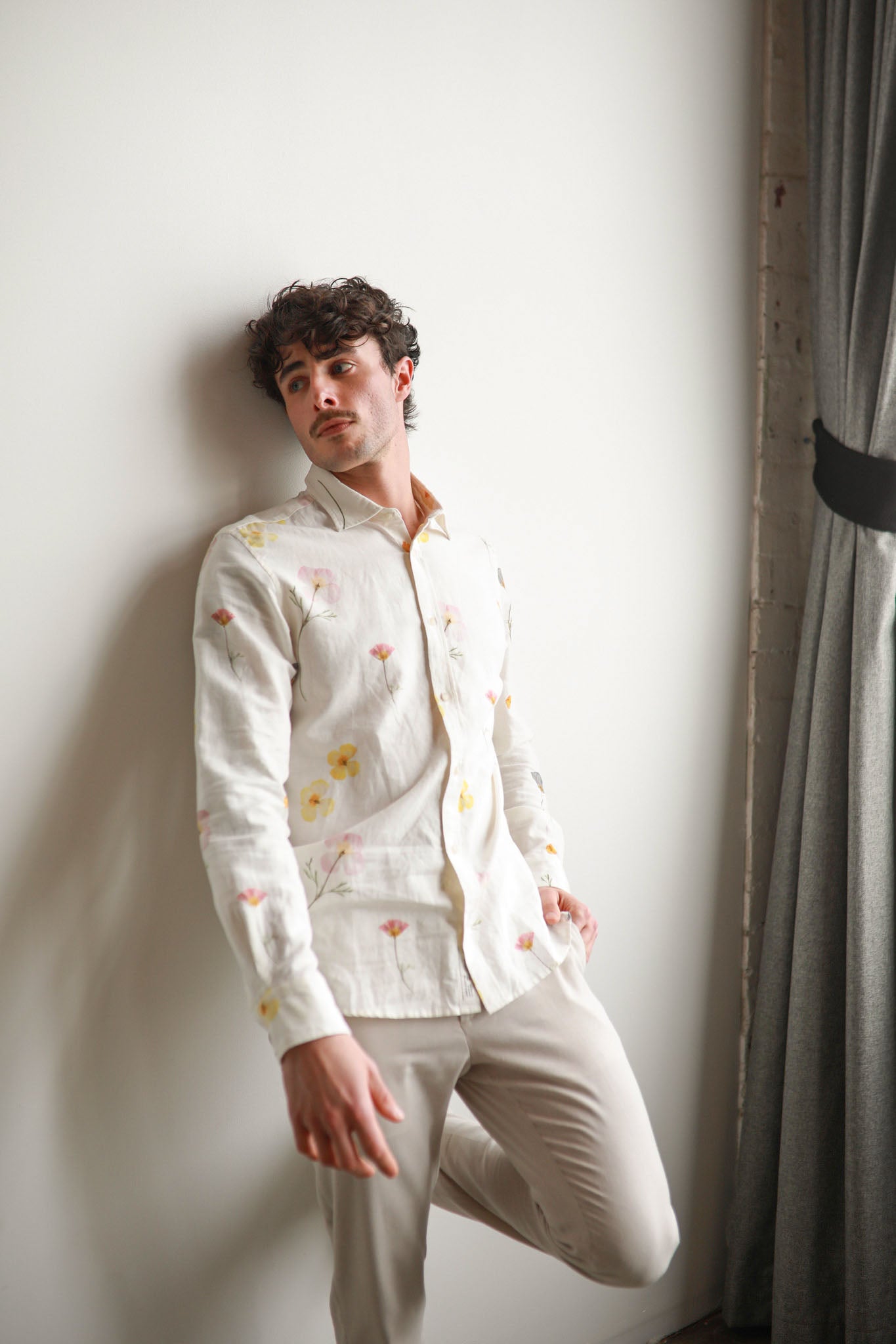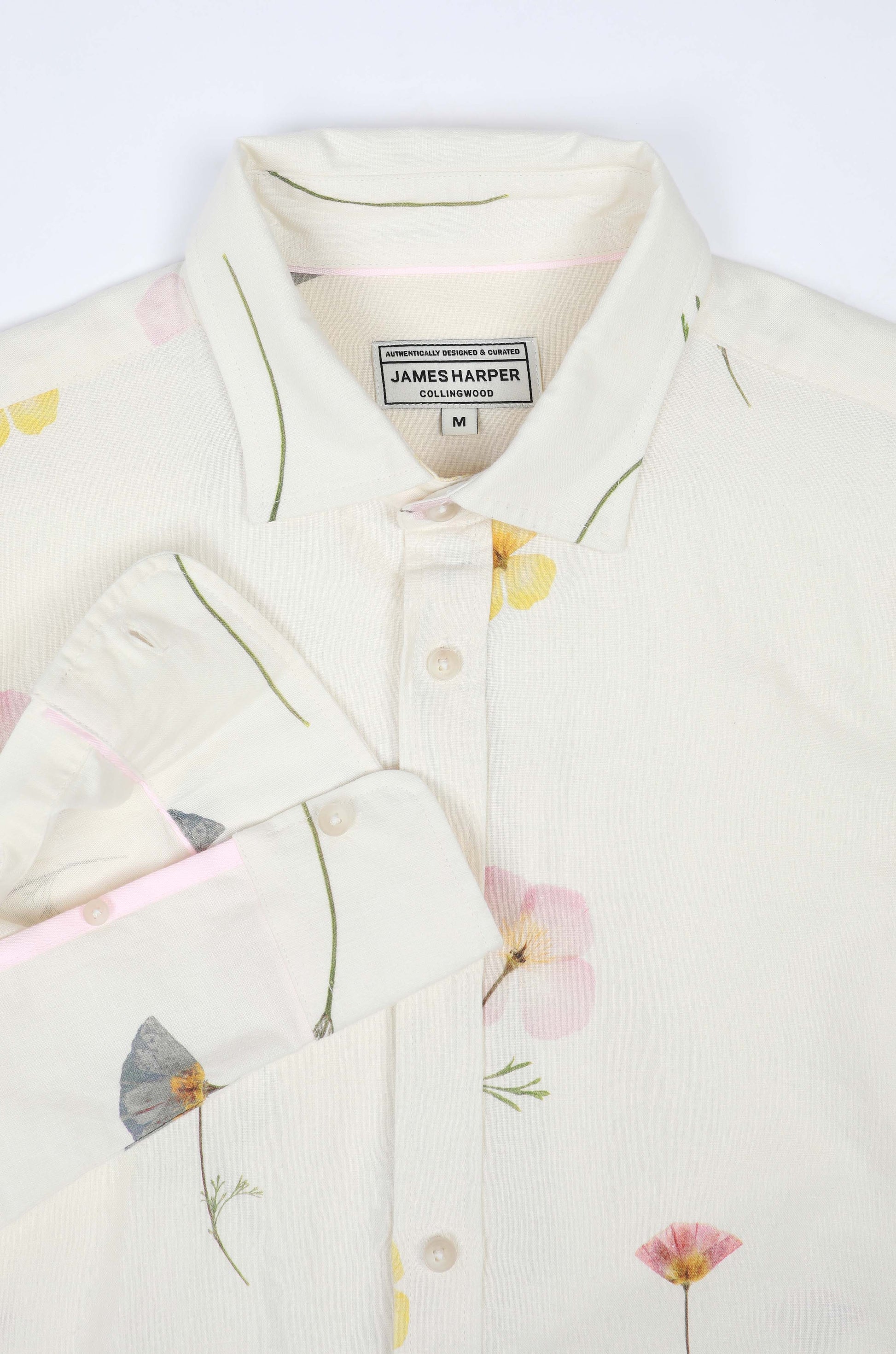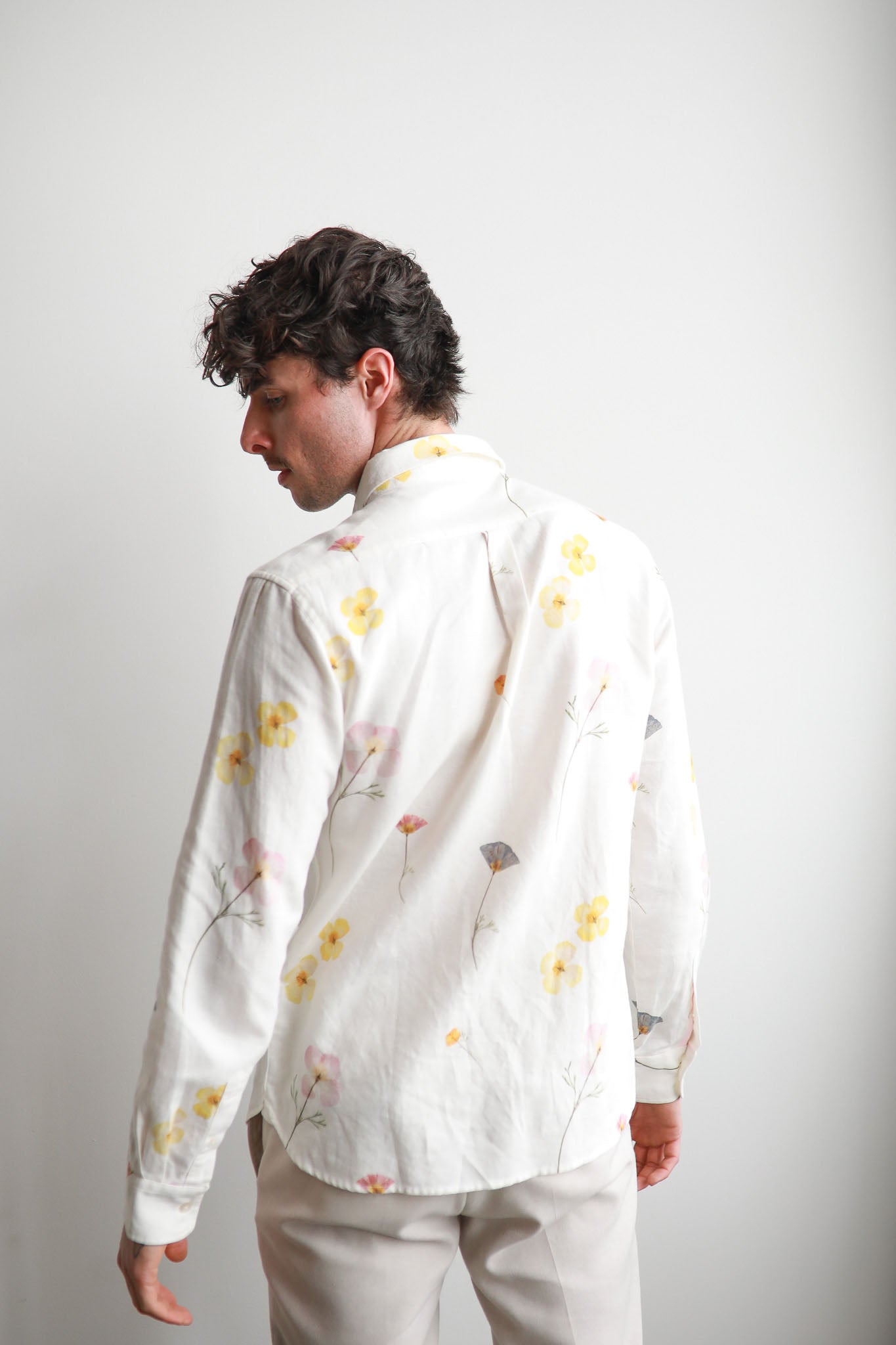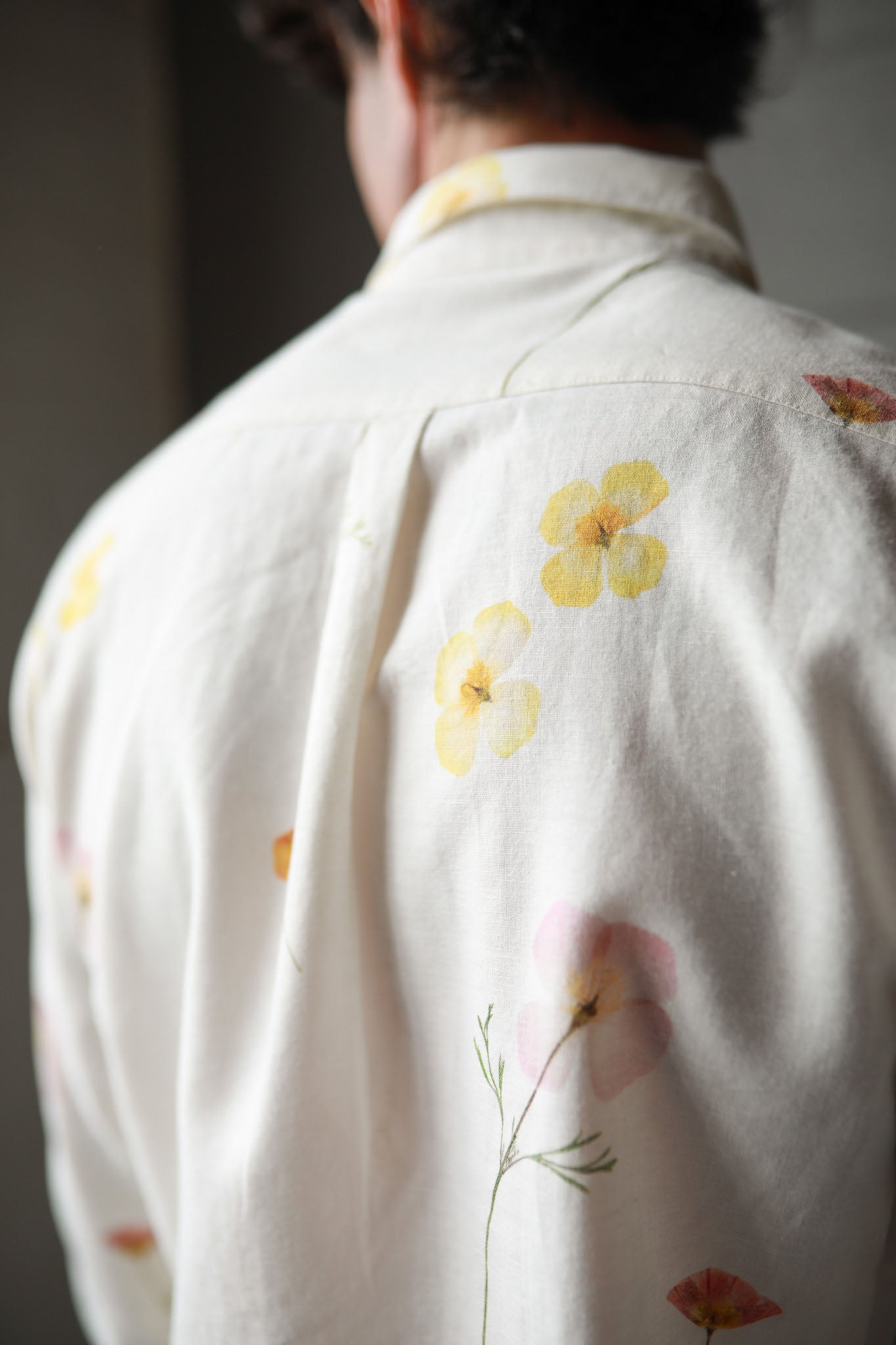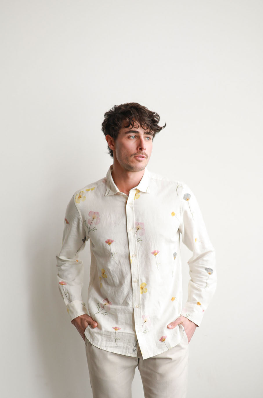 Give your wardrobe a fresh update with this pressed flower print shirt. Printed on a linen cotton blend, this shirt is a guaranteed way to introduce a statement into your wardrobe.