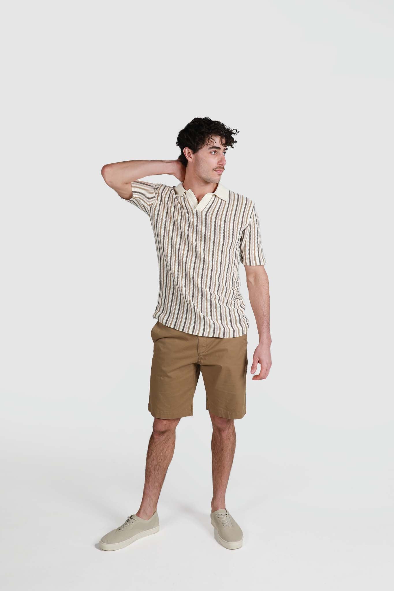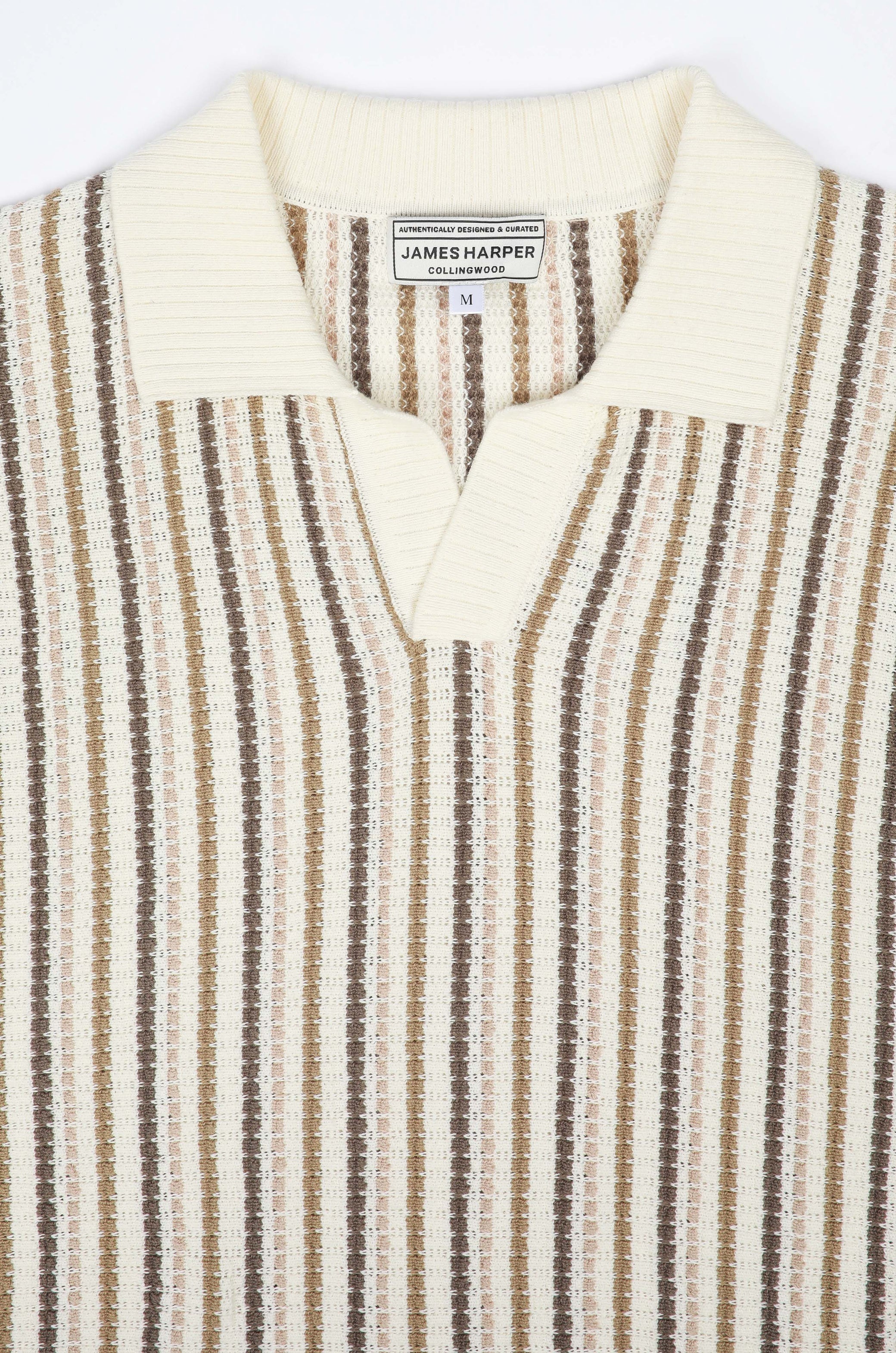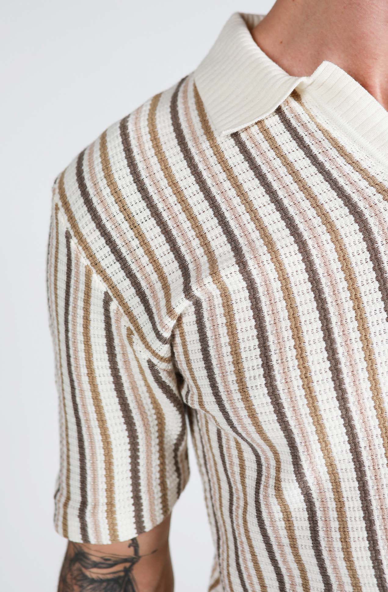 Natural Striped Open Neck Polo Knit Shirt