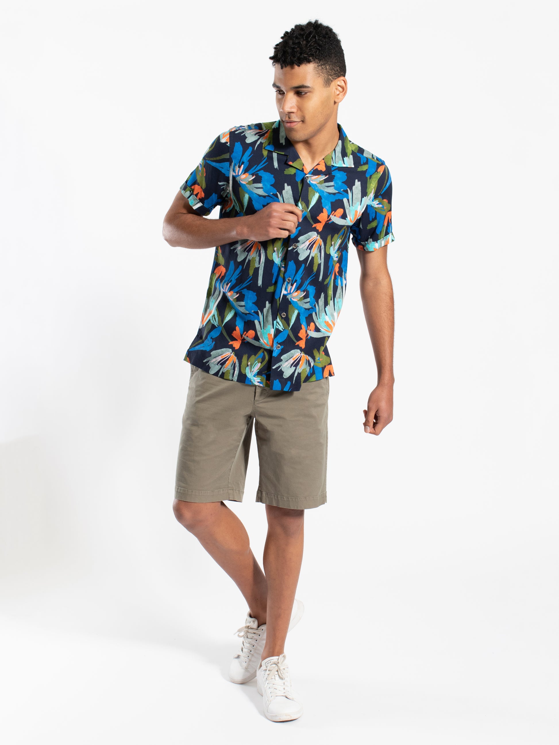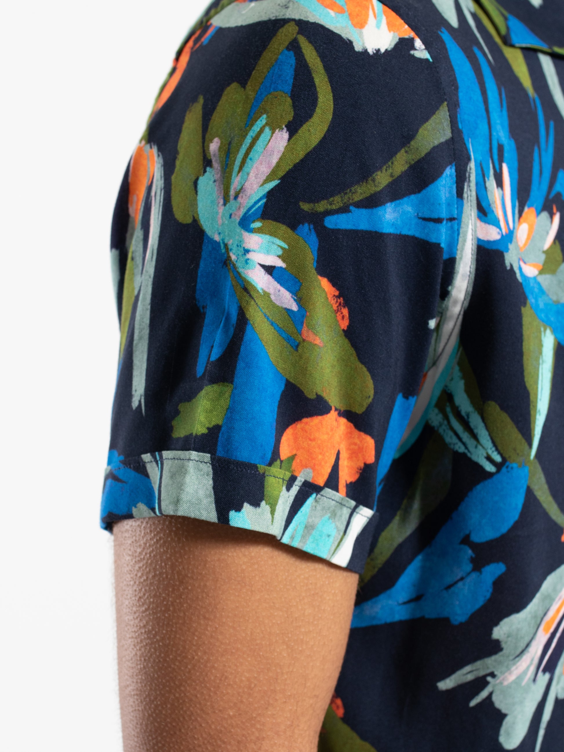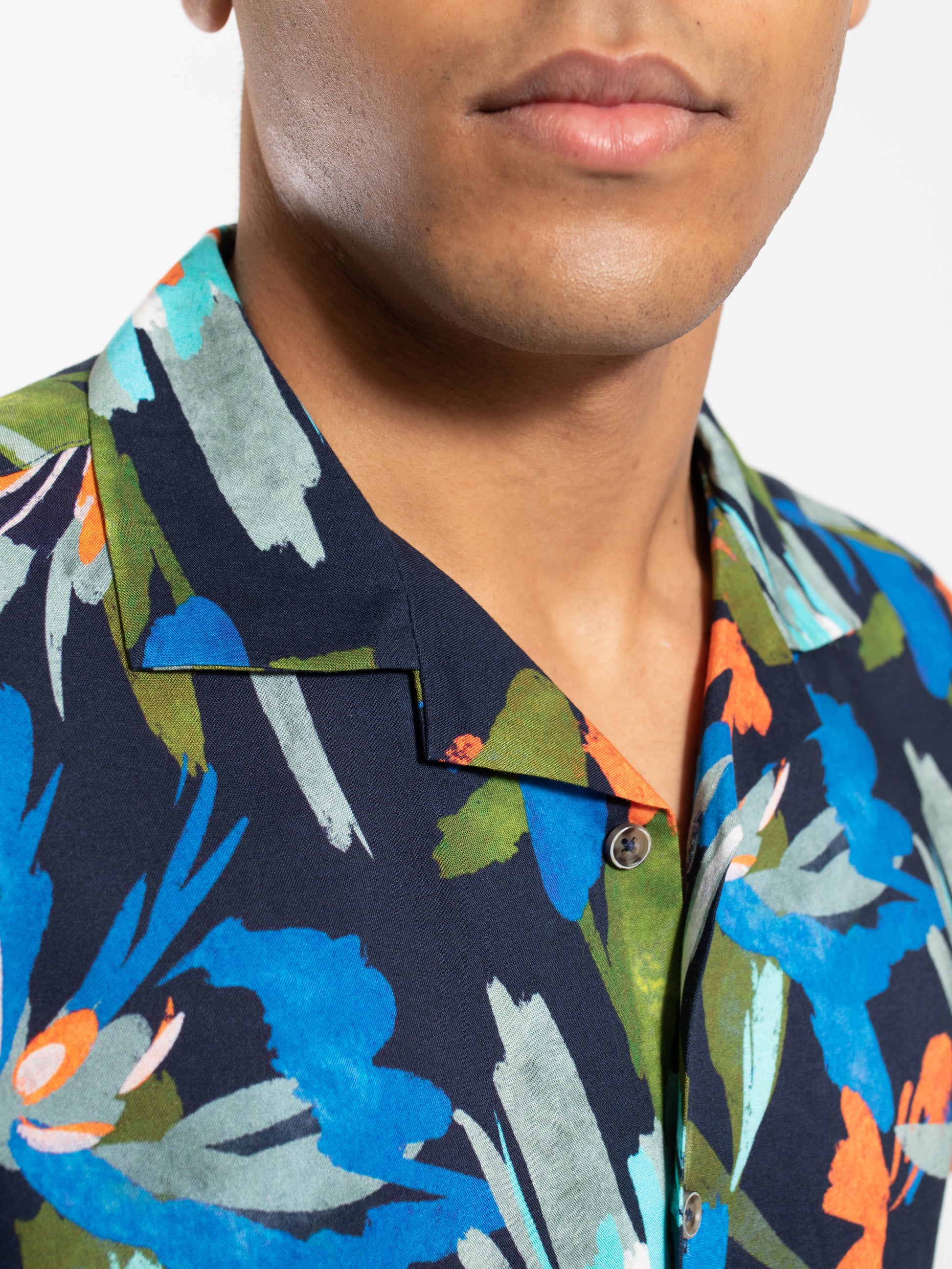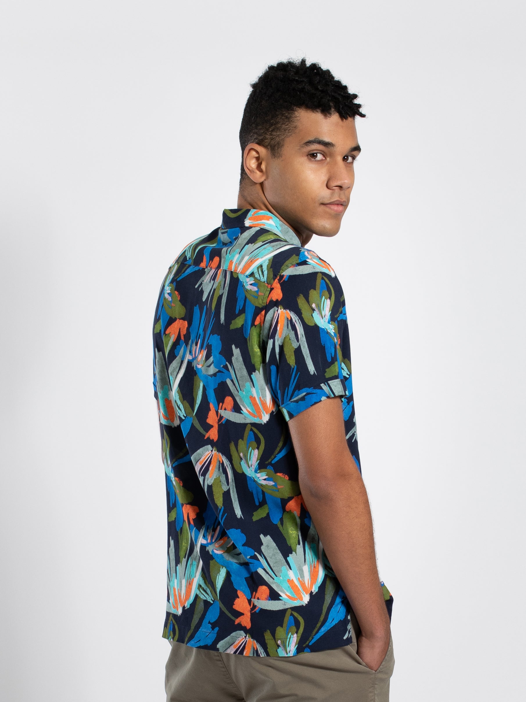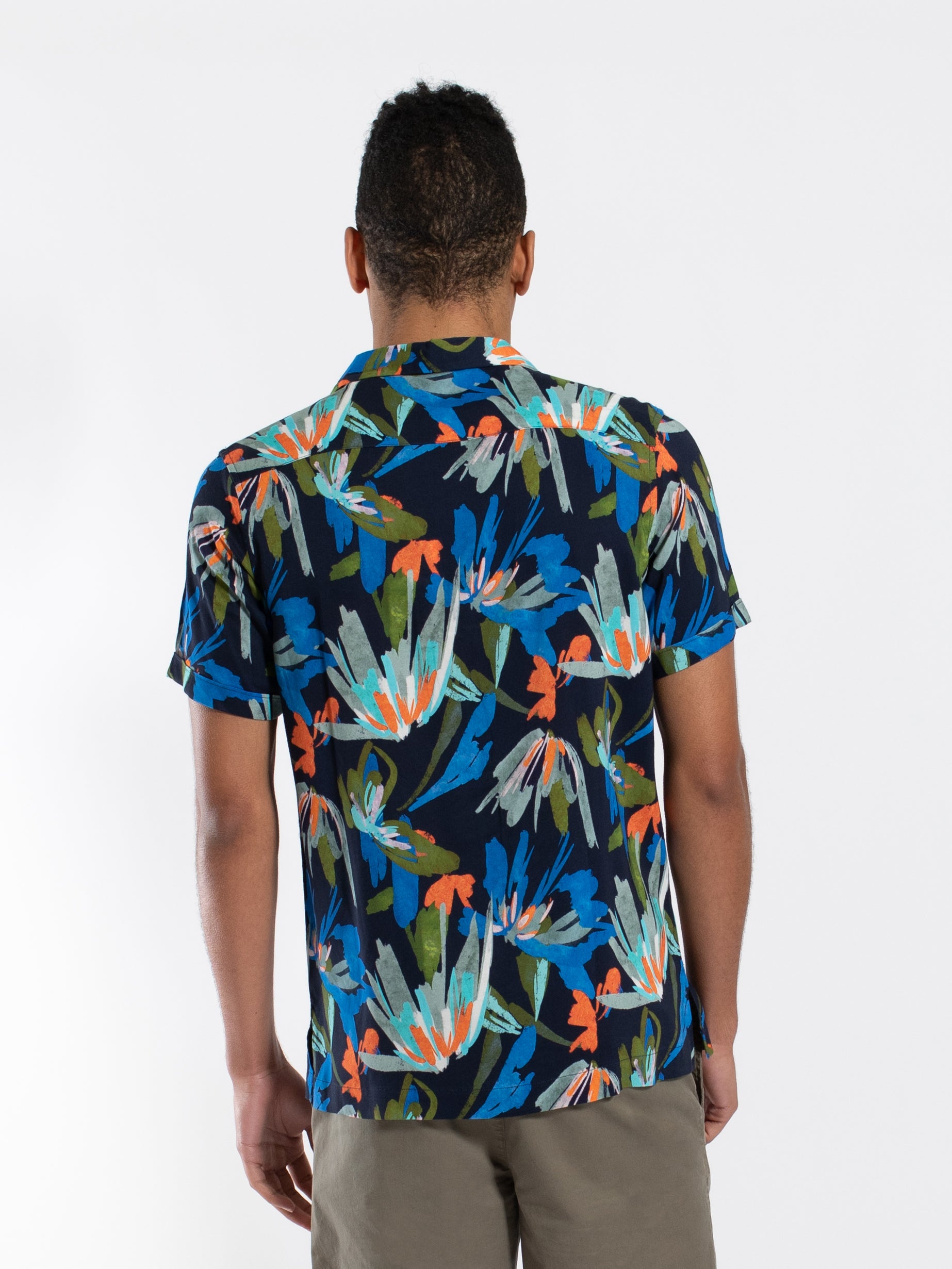 Turn heads this summer with a vibrant floral print. This short sleeve camp collar viscose shirt will keep you cool while looking on trend