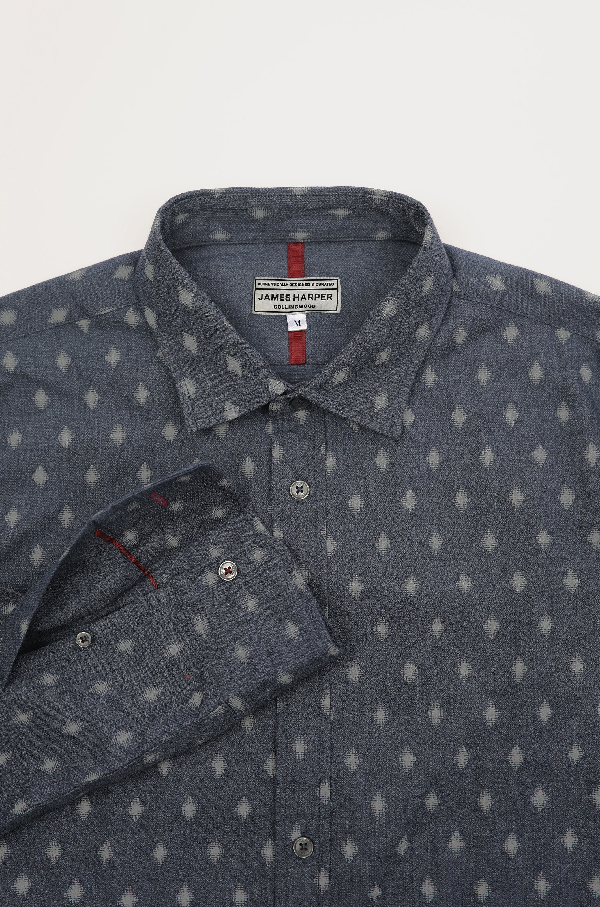 An upgrade on the everyday shirt. Crafted from a textured two-tone weave, this fit creates a flattering silhouette. Designed in Melbourne, this shirt features a simple geometric print and hidden tape trims inside the collar and cuffs. A slick choice for the modern gentleman.
