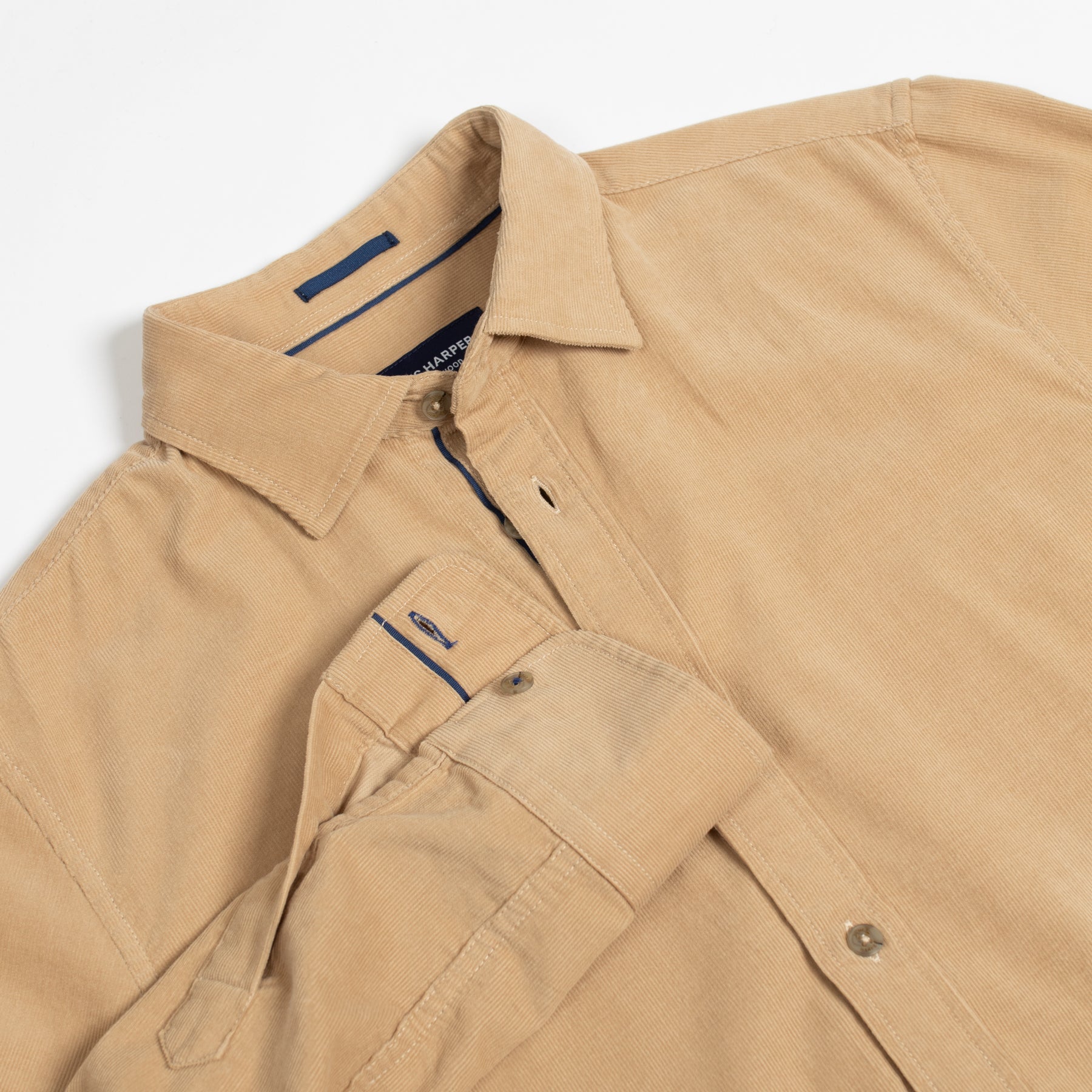 - hidden navy trims on collar, cuffs and placket