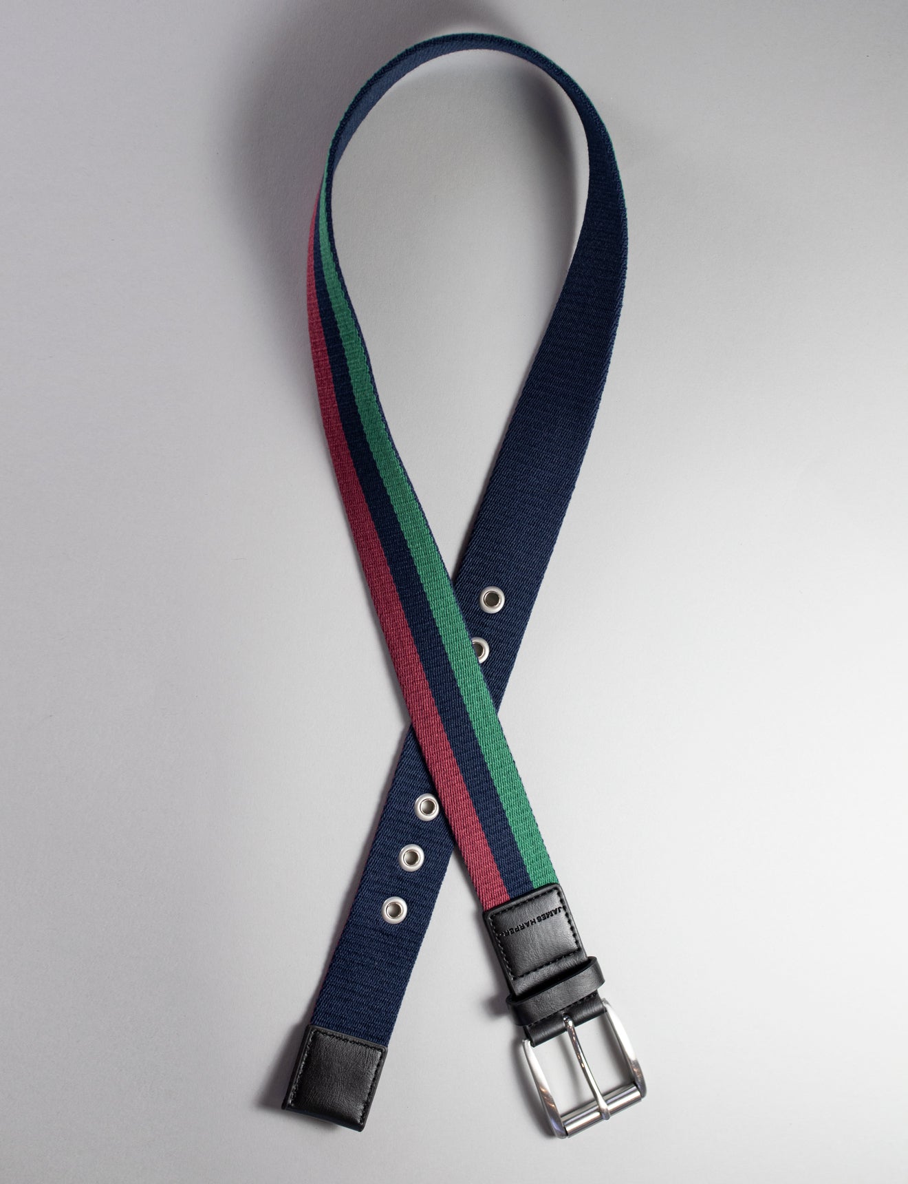 Liven up your chino look with this stripe webbing belt. Finished with contrasting leather panels at the front, the smart metal buckle ensures you stay put together all day long